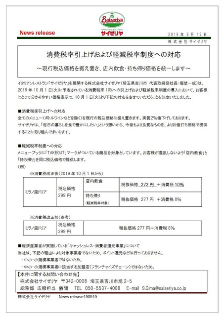 【朗報】サイゼリヤさん 消費税10%に上がるのに合わせ実質2%の値下げをして価格を据え置きにwww