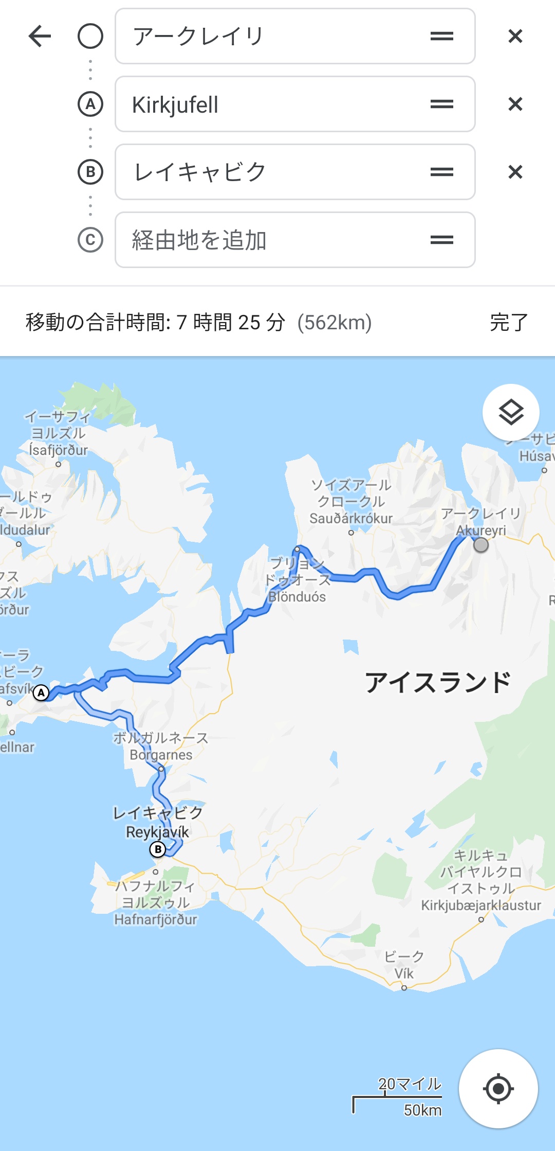 調べてみたらアークレイリからキルキュフェトル経由してレイキャビク行くくらいの距離じゃん