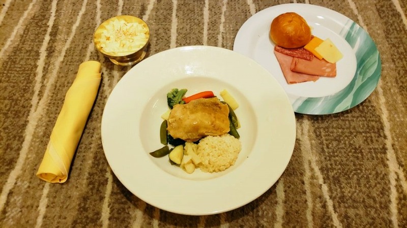 22:00 夕食 今日初めての温かい食事!バターライス、紫キャベツとグリンピース、蒸しチキン、パン、ハム、チーズ、アップルパイ 健康を考えてかいつもより薄味ですが美味しい!