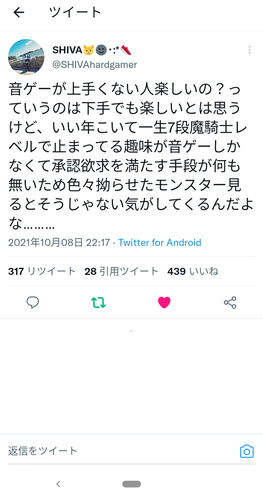 音ゲーは途中からひたすら練習して努力せなあかんからなワイは楽器で良くねと思って音ゲーをやめた