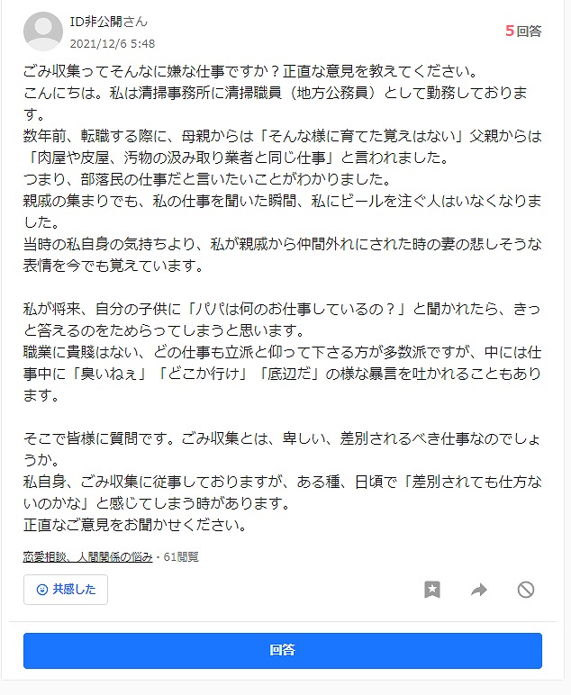 【悲報】ごみ収集員、両親・親戚から差別されまくって泣く