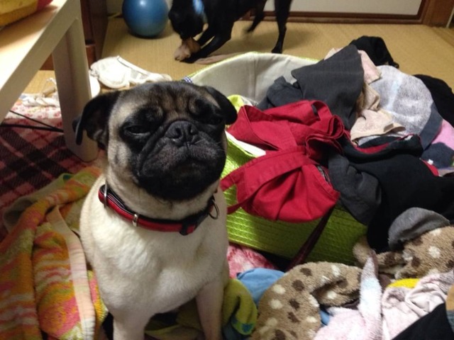 洗濯物入ったカゴを荒らしてバレて説教食らってるところや