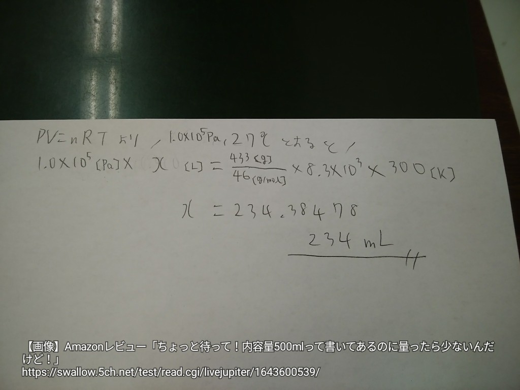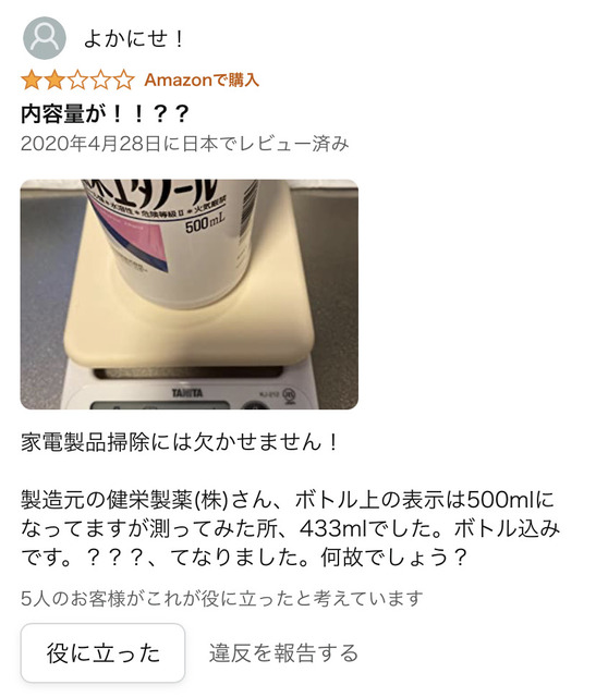 【画像】Amazonレビュー「内容量500mlって書いてあるのに量ったら少ないんだけど!」