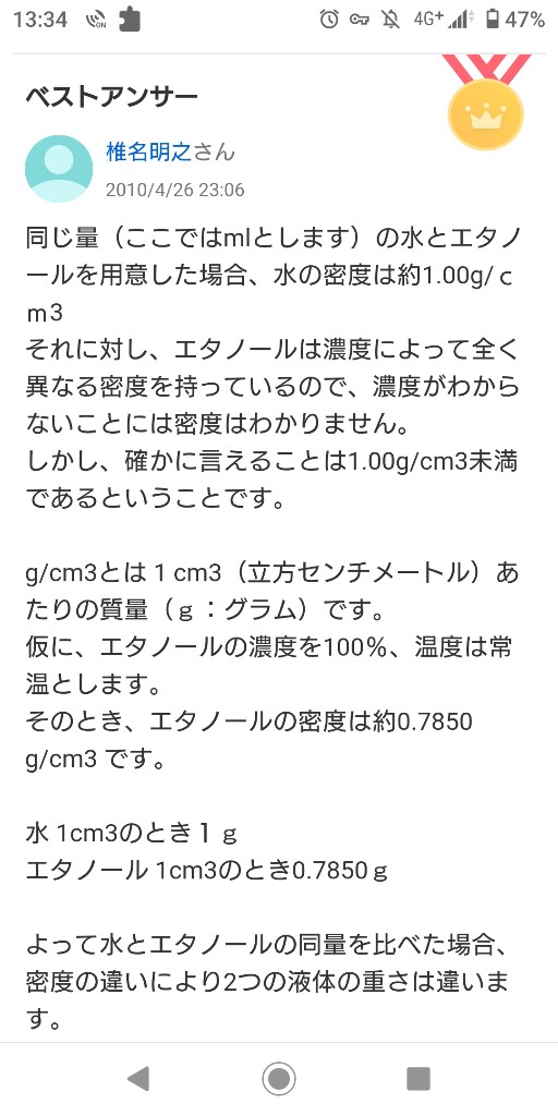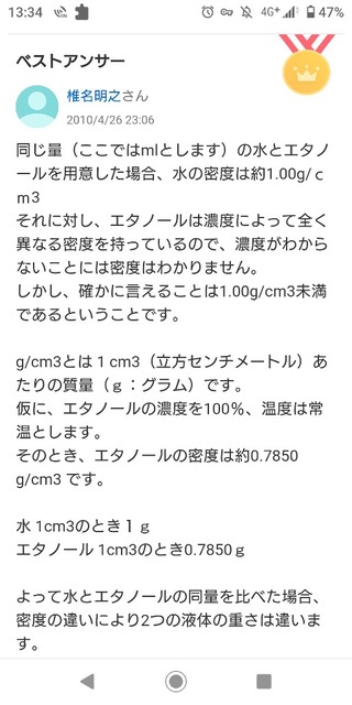 水の方が分子間力?かなんかで密になっとるんか