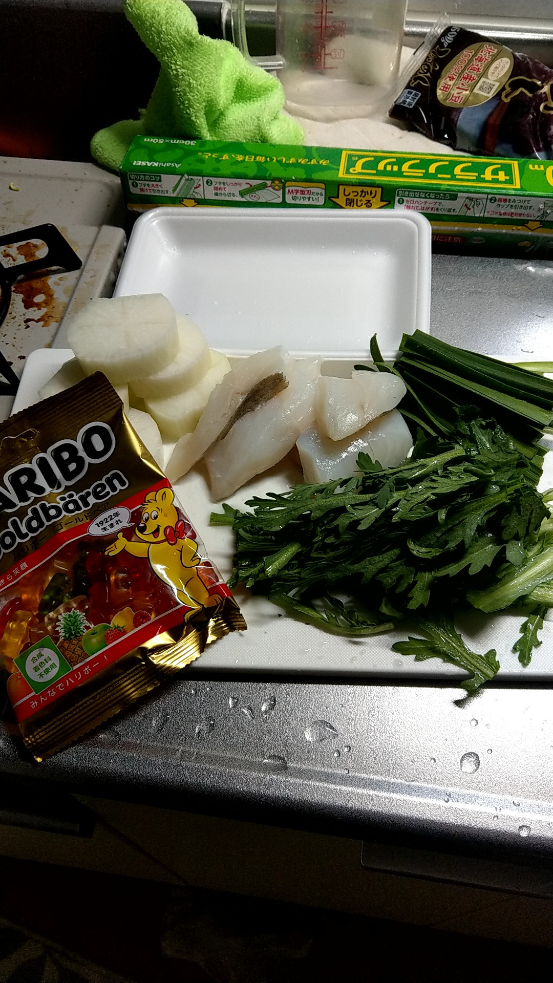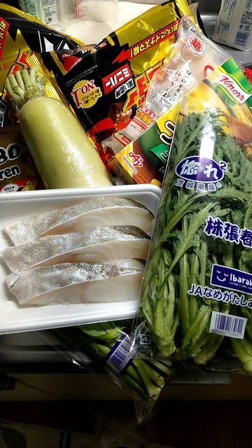 鱈、春菊、ハリボーグミ、にら、大根ね