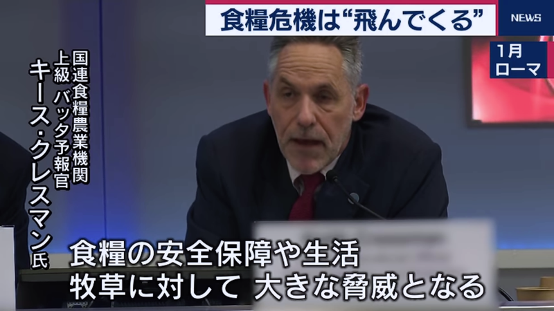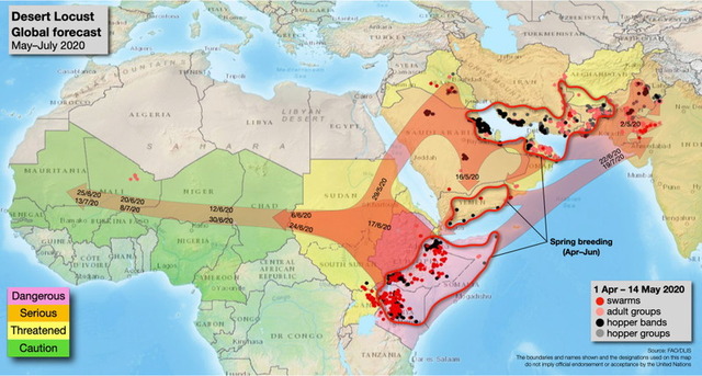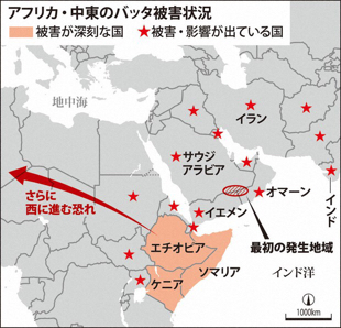 アフリカ東部や中東で、異常気象が引き金となってバッタの大群が発生し、農作物に深刻な被害が出ている。元々貧しい地域が多く、国連食糧農業機関(FAO)は、特にアフリカ東部6カ国で2000万人が食糧危機に直面しているとして、「前例のない脅威」と強調。新型コロナウイルスの影響で対策が遅れる懸念も出ている。
